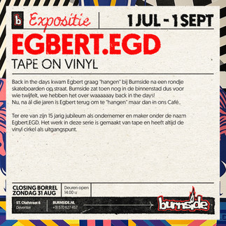Van 1 juli tot 1 September 2025 (verlengd tot 7 sept) exposeert Egbert een aantal van zijn "Tape On Vinyl" werken. Daarnaast komen er een aantal van zijn andere Tape Art werken te hangen. Als kers op de taart staat jullie straks ook nog een Tape Art verrassing te wachten op het toilet.